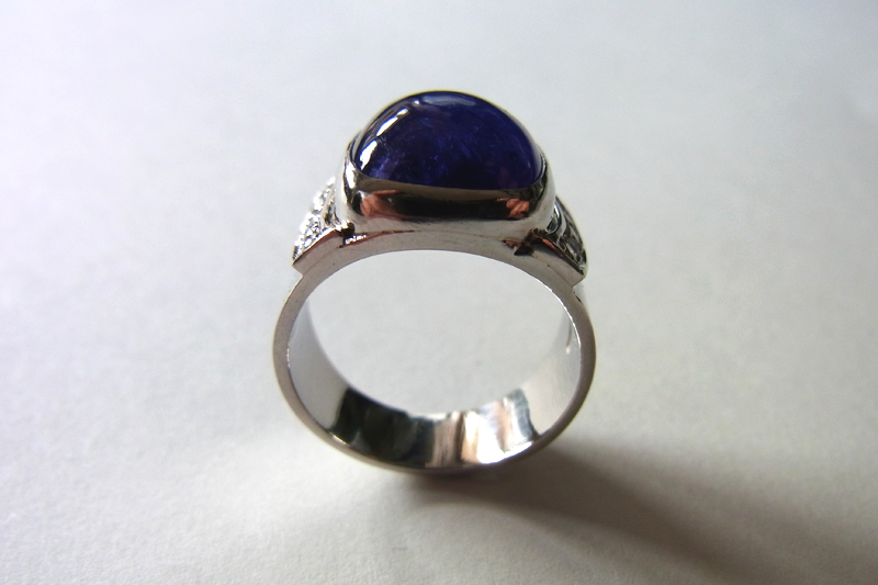 ホーム > オリジナルジュエリー > リング・指輪 > Pt プラチナタンザナイト カボッションリング 2016/08/07 内包物は多めですが、色目は濃く綺麗な青のスクエアカボッションタンザナイトをメンズ風に仕上げました。石のサイズが1センチ角位あり、綺麗な色との目立ち感は人目を惹きます。最近カボッションタンザナイトのルースが比較的容易に手に入りますが、品質がバラバラで、色目かクオリティーかで悩みます。こちらのように美しい青のルースは、存在を邪魔しないプラチナ色で加工するのが一番です。 - リング・指輪, オリジナルジュエリー